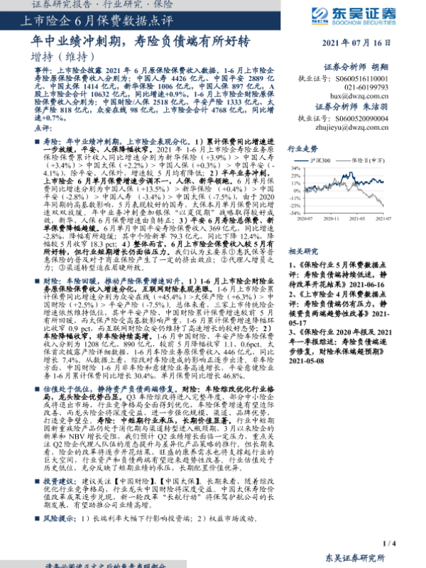 【东吴证券】【20210716】上市险企6月保费数据点评-4页