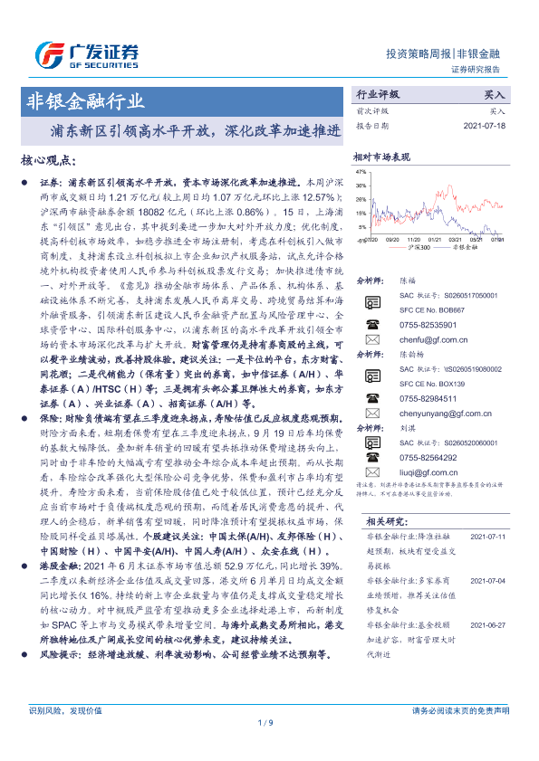 【广发证券】【20210718】非银金融行业投资策略周报:浦东新区引领高水平开放,深化改革加速推进-9页
