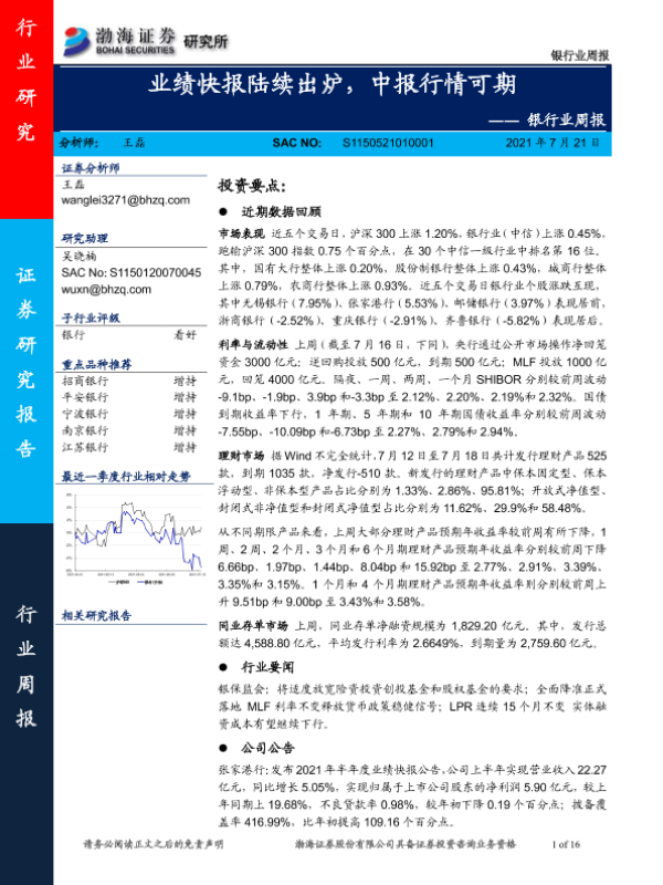 【渤海证券】【20210721】银行业周报:业绩快报陆续出炉,中报行情可期-16页