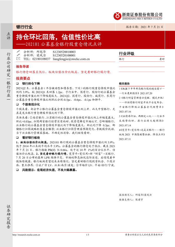 【浙商证券】【20210721】2021H1公募基金银行股重仓情况点评-3页