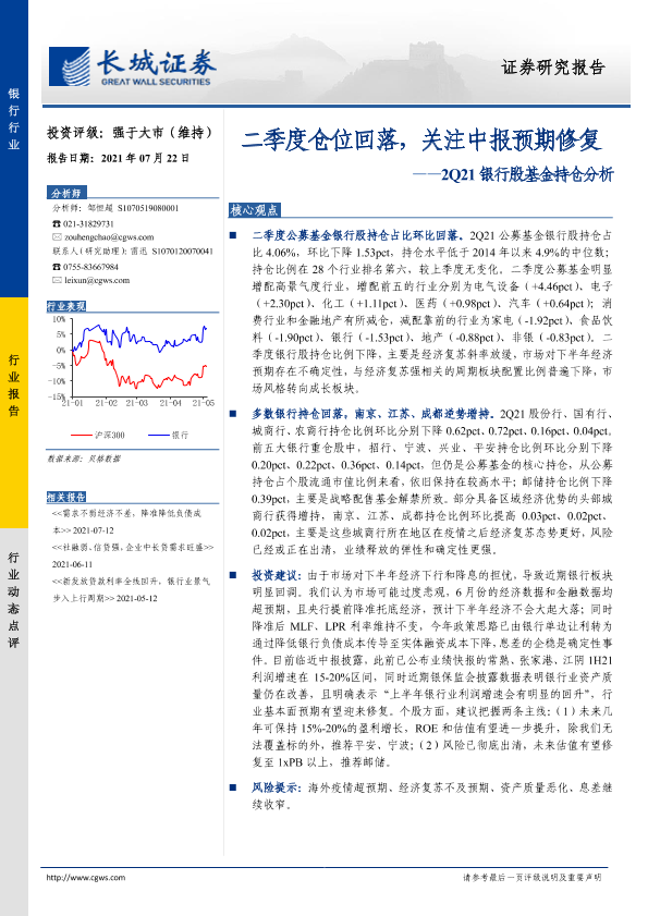 【长城证券】【20210722】2Q21银行股基金持仓分析:二季度仓位回落,关注中报预期修复-7页