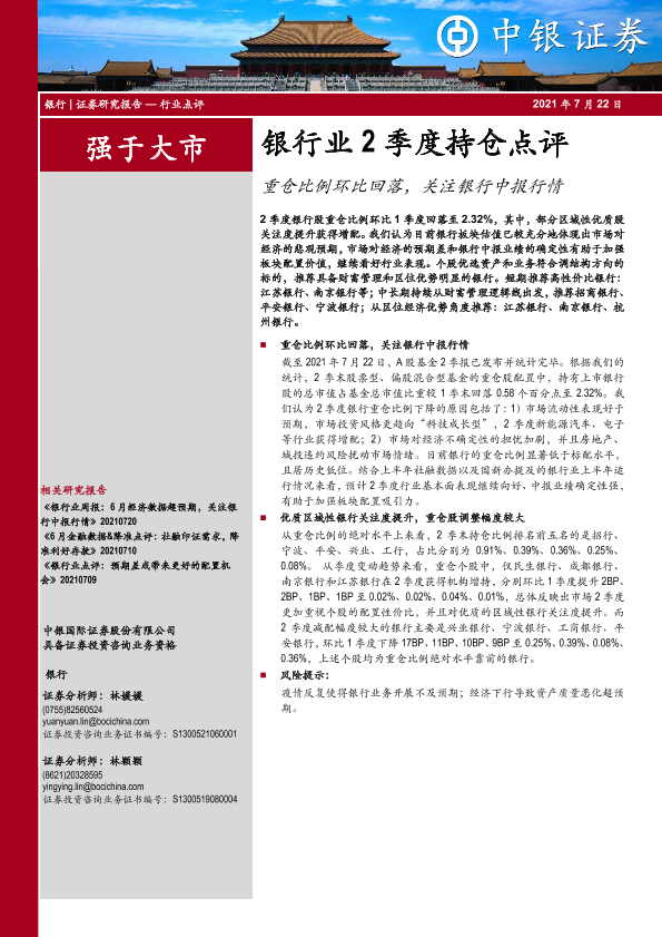 【中银证券】【20210722】银行业2季度持仓点评:重仓比例环比回落,关注银行中报行情-5页