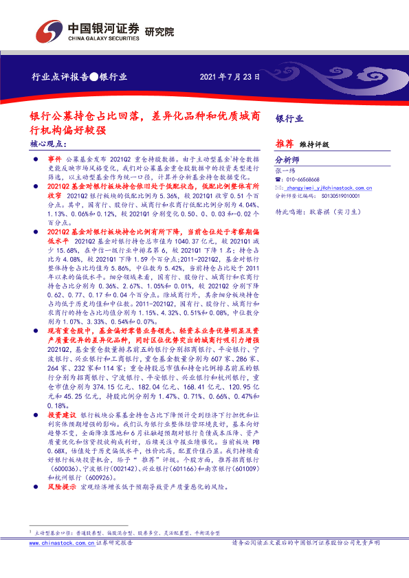 【银河证券】【20210723】银行业行业点评报告:银行公募持仓占比回落,差异化品种和优质城商行机构偏好较强-5页