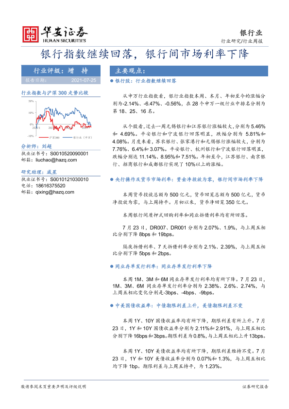 【华安证券】【20210725】银行行业周报:银行指数继续回落,银行间市场利率下降-23页
