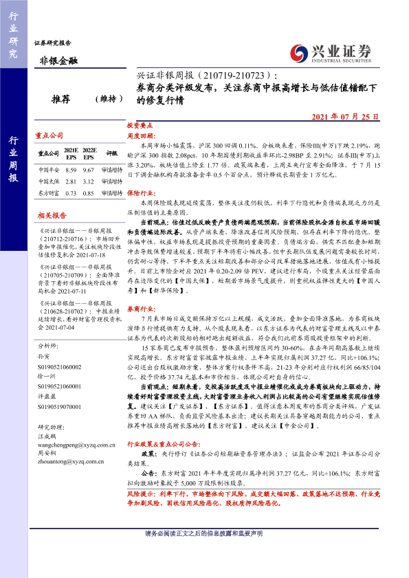 【兴业证券】【20210725】兴证非银周报:券商分类评级发布,关注券商中报高增长与低估值错配下的修复行情-18页
