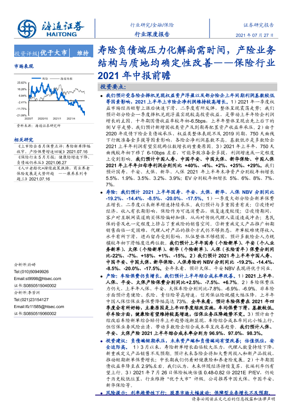 【海通证券】【20210727】保险行业2021年中报前瞻:寿险负债端压力化解尚需时间,产险业务结构与质地均确定性改善-17页
