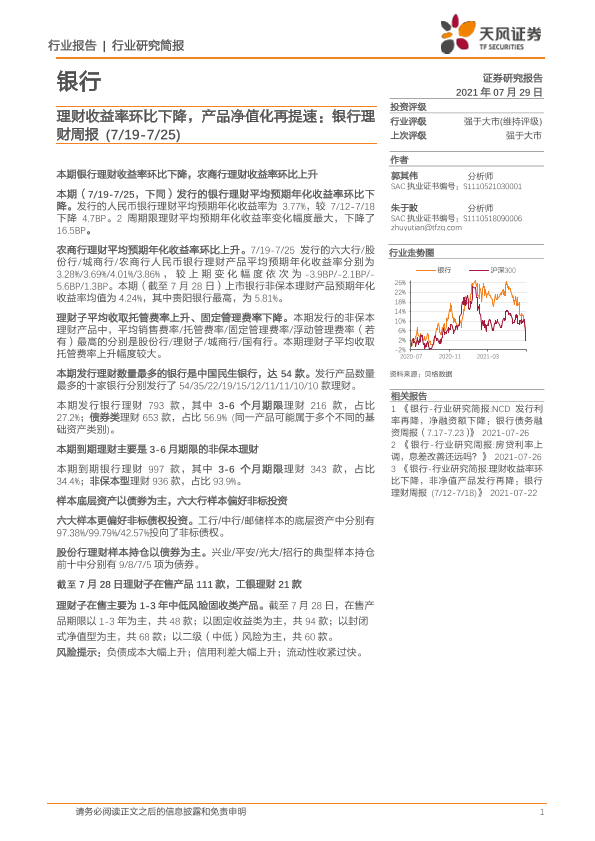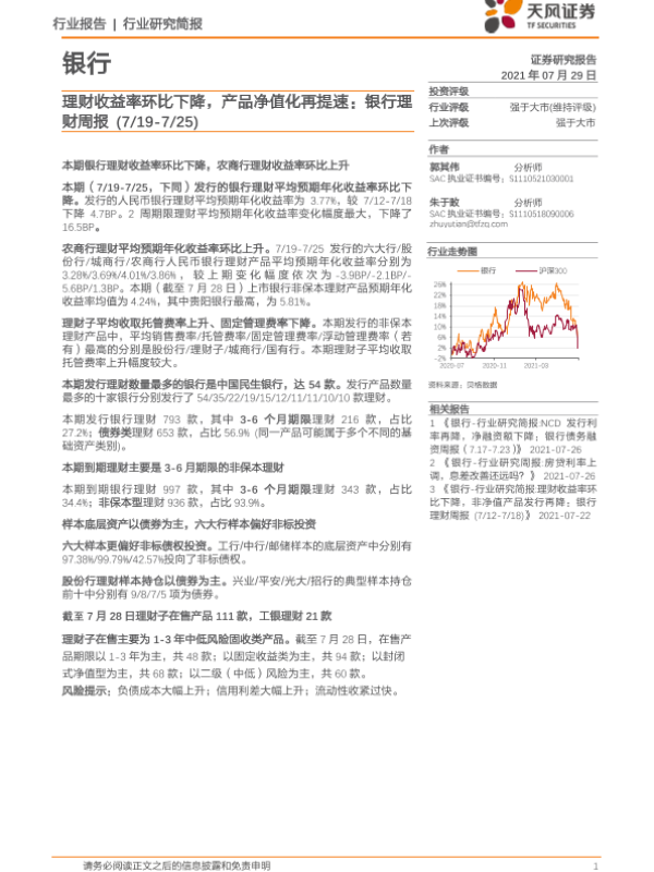【天风证券】【20210729】理财收益率环比下降,产品净值化再提速-18页