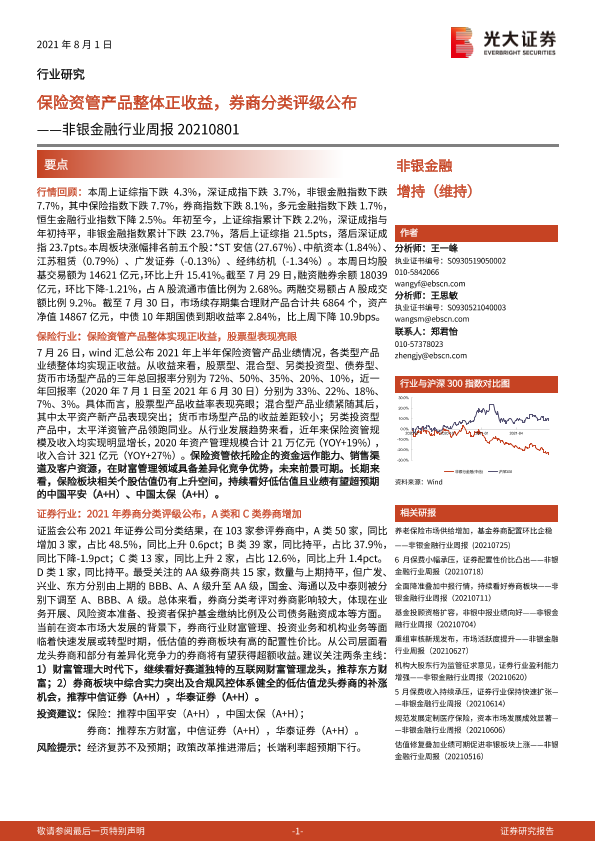 【光大证券】【20210801】非银金融行业周报:保险资管产品整体正收益,券商分类评级公布-11页