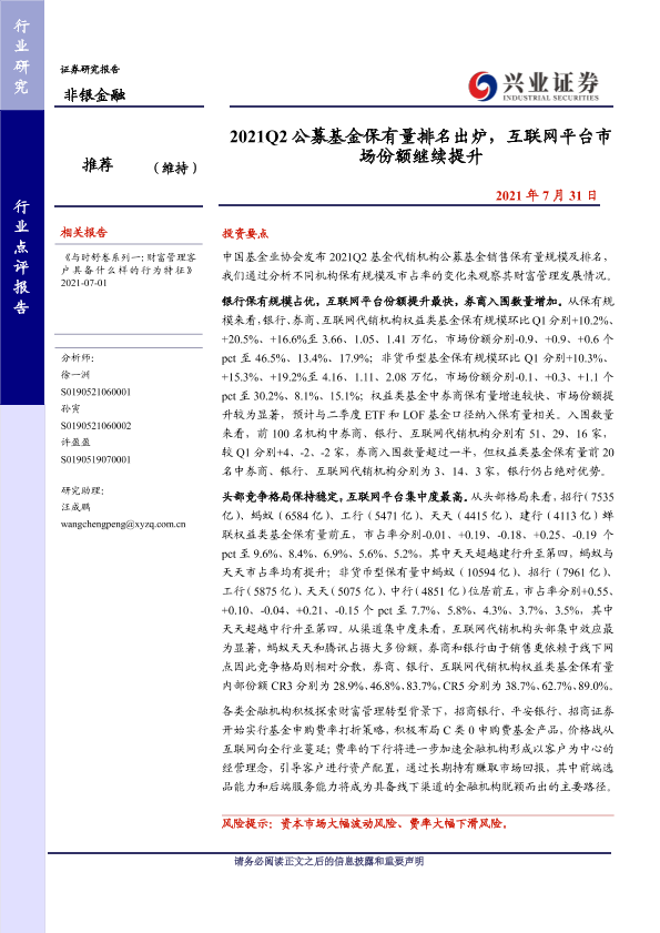 【兴业证券】【20210731】2021Q2公募基金保有量排名出炉,互联网平台市场份额继续提升-5页