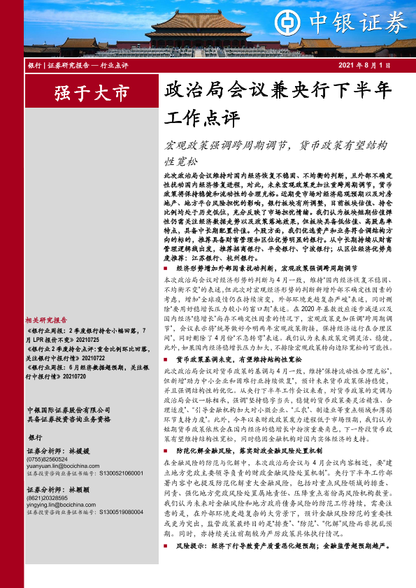 【中银证券】【20210801】政治局会议兼央行下半年工作点评:宏观政策强调跨周期调节,货币政策有望结构性宽松-7页