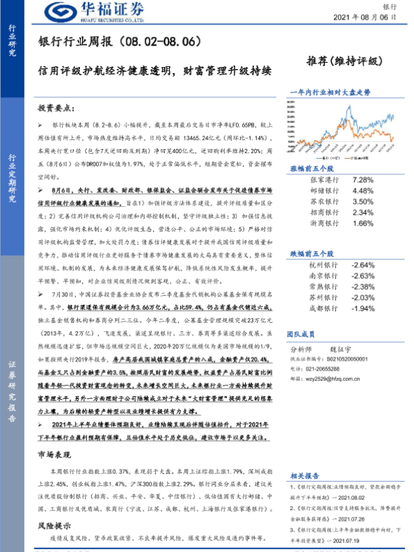 【华福证券】【20210806】银行行业周报:信用评级护航经济健康透明,财富管理升级持续-17页