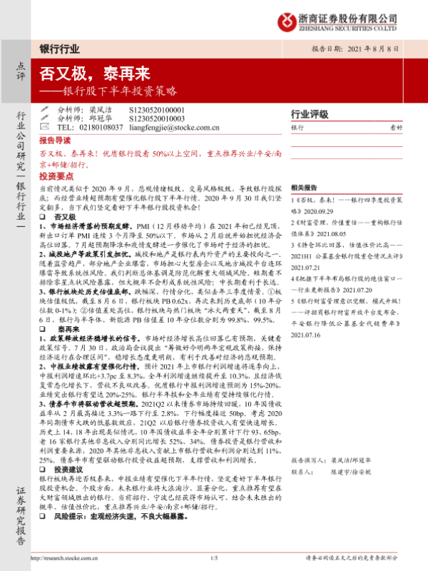 【浙商证券】【20210808】银行股下半年投资策略:否又极,泰再来-5页