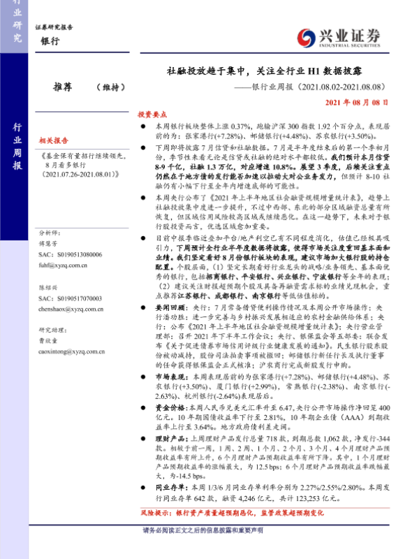 【兴业证券】【20210808】银行业周报:社融投放趋于集中,关注全行业H1数据披露-15页
