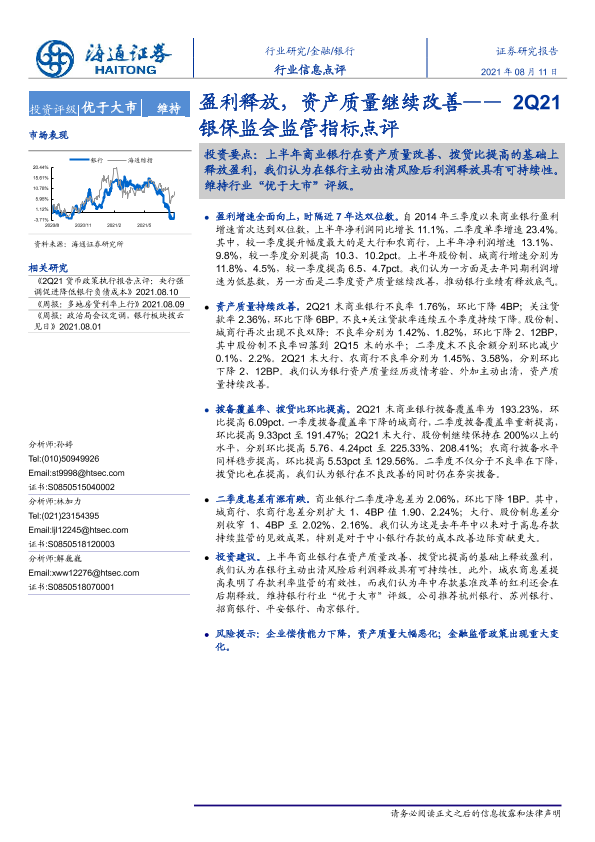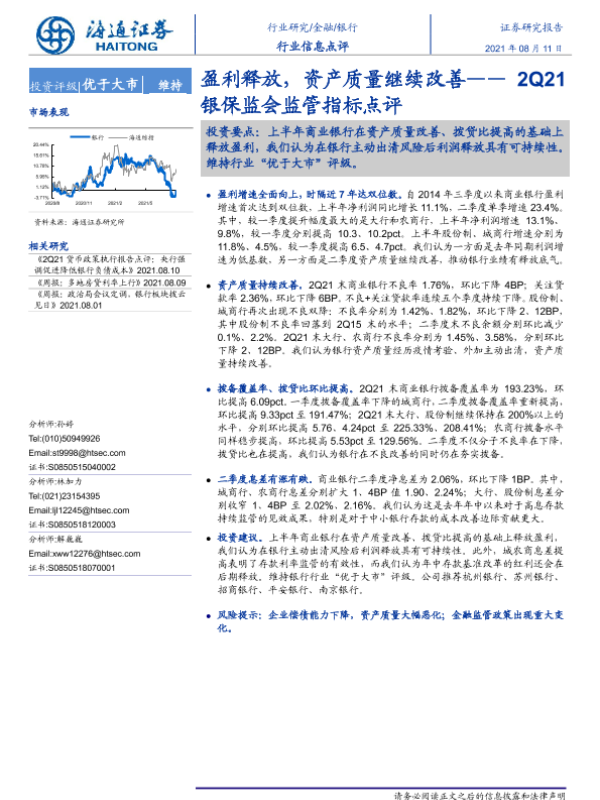 【海通证券】【20210811】2Q21银保监会监管指标点评:盈利释放,资产质量继续改善-3页