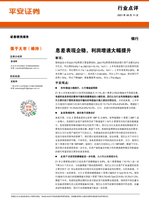 【平安证券】【20210811】银行行业点评:息差表现企稳,利润增速大幅提升-4页