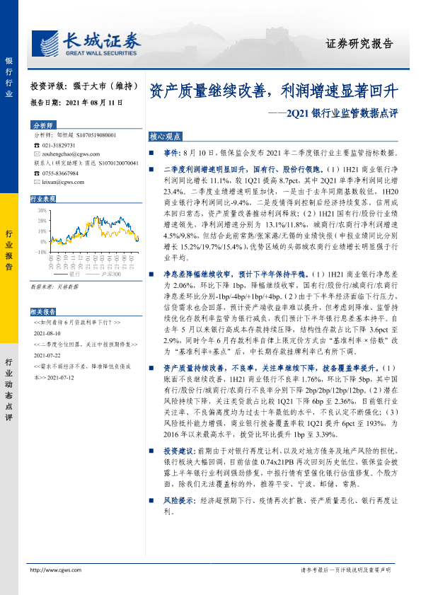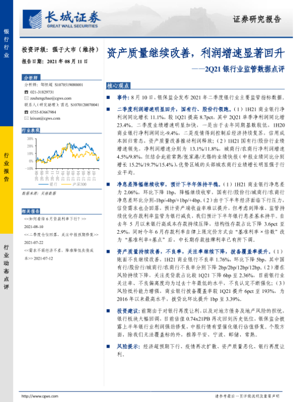 【长城证券】【20210811】2Q21银行业监管数据点评:资产质量继续改善,利润增速显著回升-4页