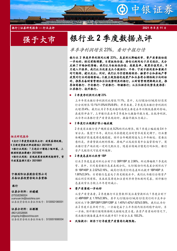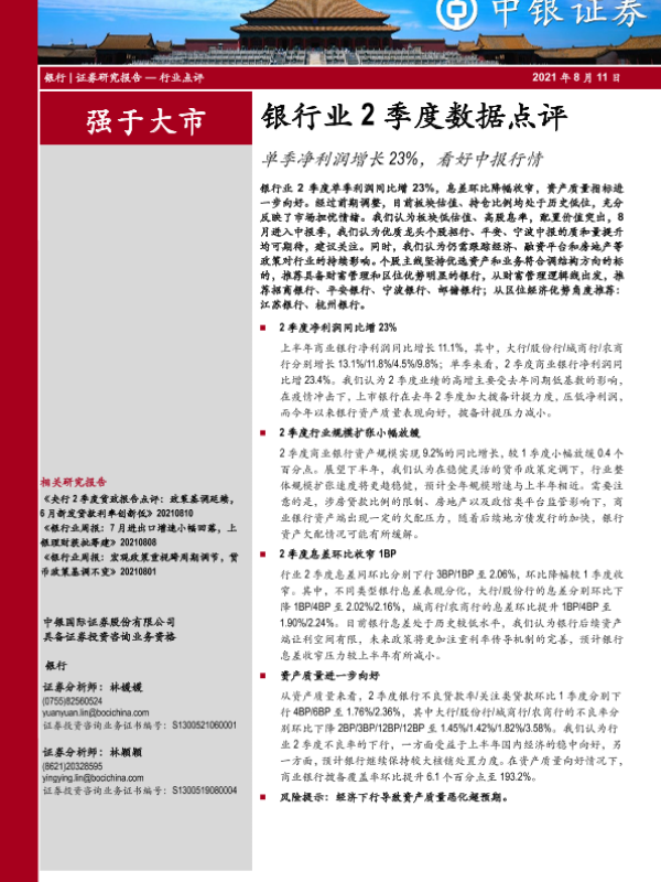 【中银证券】【20210811】银行业2季度数据点评:单季净利润增长23%,看好中报行情-6页