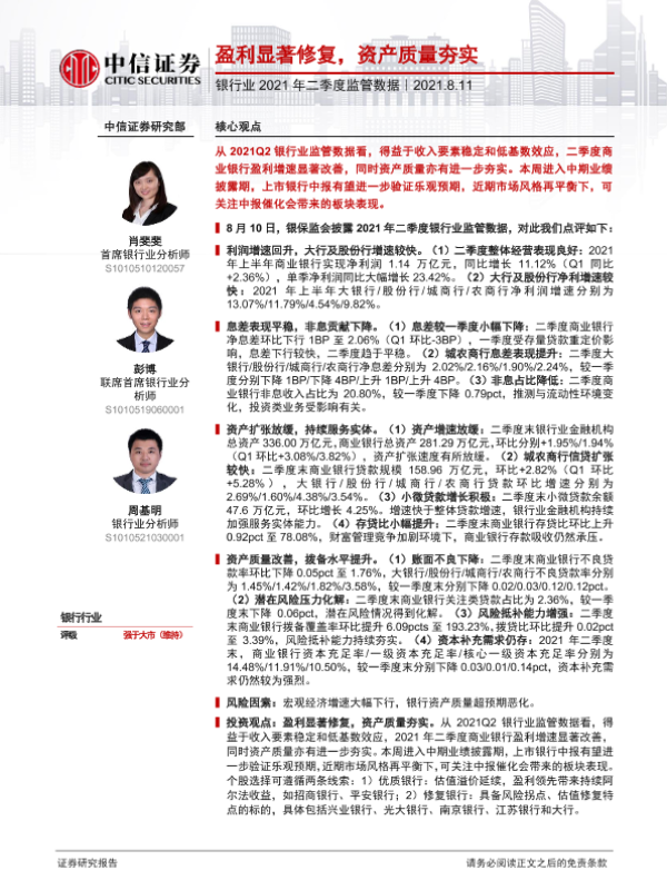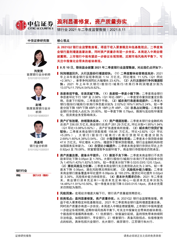 【中信证券】【20210811】银行业2021年二季度监管数据:盈利显著修复,资产质量夯实-5页