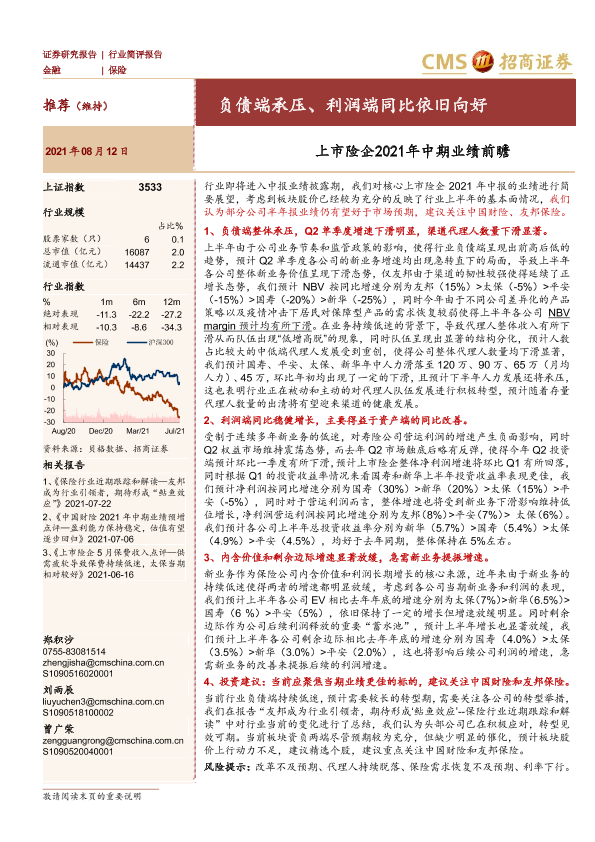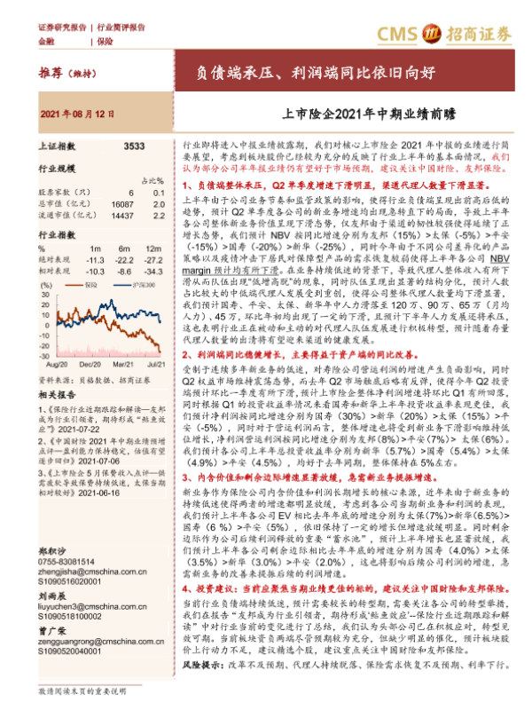 【海通证券】【20210812】上市险企2021年中期业绩前瞻:负债端承压、利润端同比依旧向好-2页