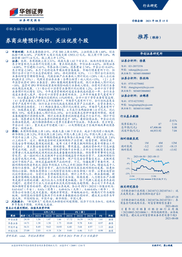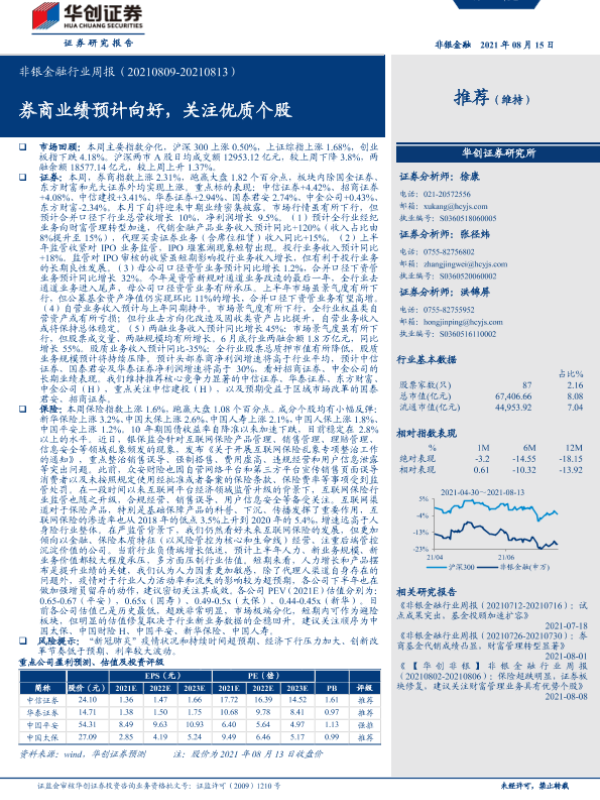 【华创证券】【20210815】非银金融行业周报:券商业绩预计向好,关注优质个股-18页