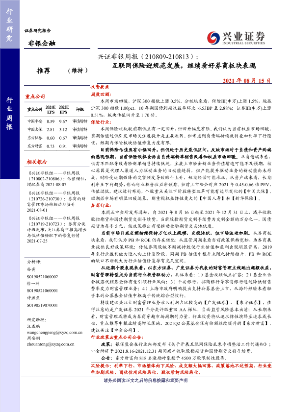 【兴业证券】【20210815】互联网保险迎规范发展,继续看好券商板块表现-14页