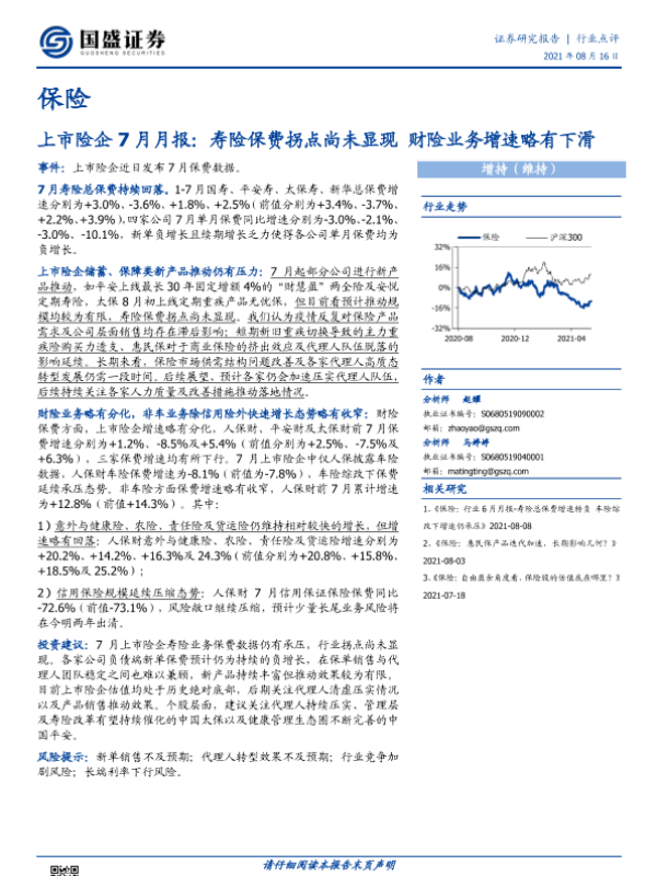 【国盛证券】【20210816】上市险企7月月报:寿险保费拐点尚未显现 财险业务增速略有下滑-3页