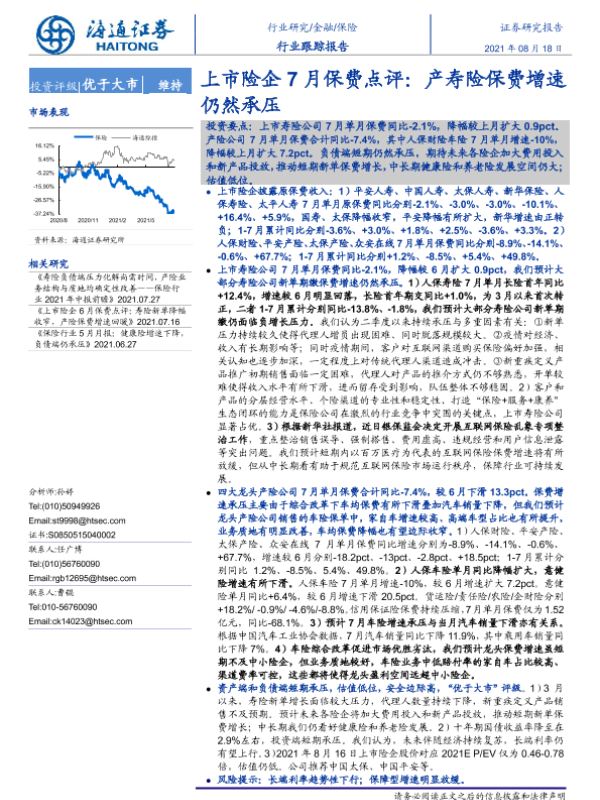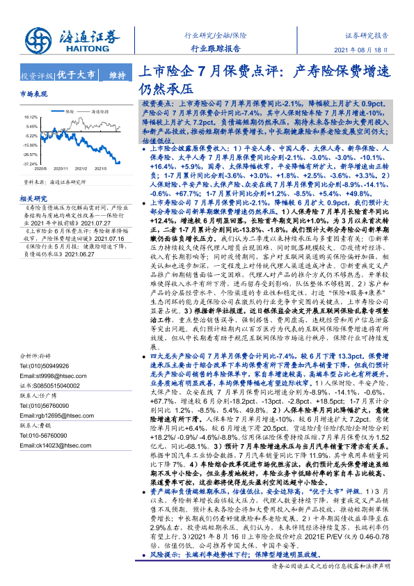【海通证券】【20210818】上市险企7月保费点评:产寿险保费增速仍然承压-5页