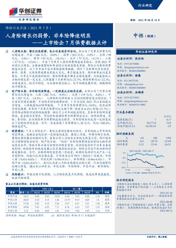【华创证券】【20210818】保险行业月报(2021年7月)-上市险企7月保费数据点评-8页
