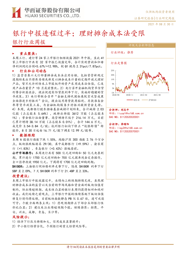 【华西证券】【20210830】银行行业周报:银行中报进程过半;理财摊余成本法受限-9页