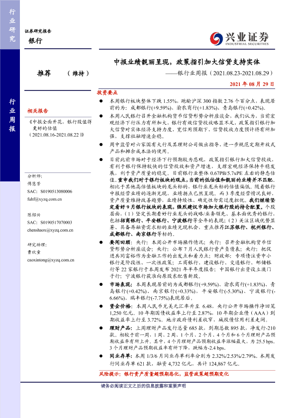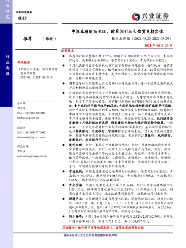 【兴业证券】【20210829】银行业周报:中报业绩靓丽呈现,政策指引加大信贷支持实体-17页