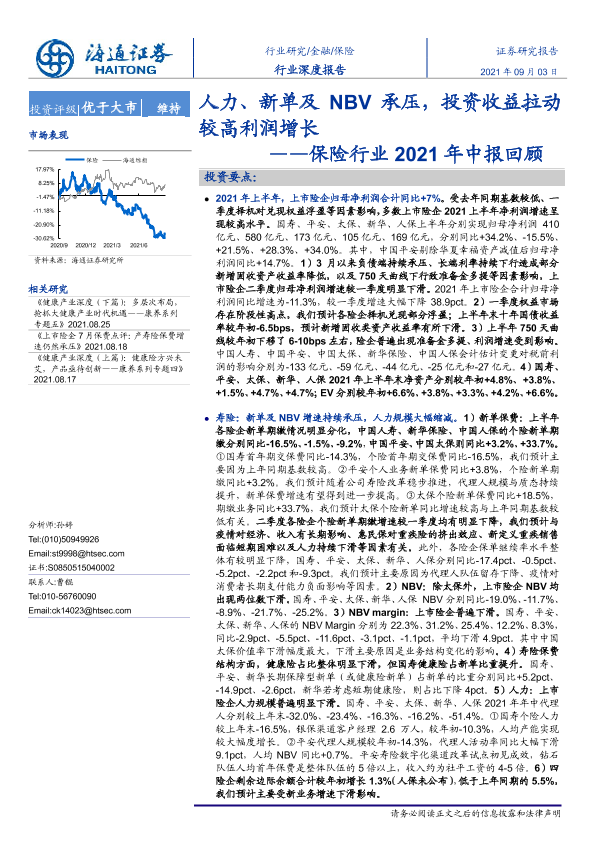 【海通证券】【20210903】保险行业2021年中报回顾:人力、新单及NBV承压,投资收益拉动较高利润增长-28页
