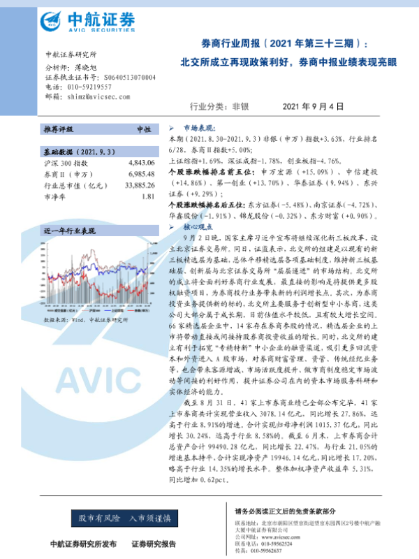 【中航证券】【20210904】券商行业周报:北交所成立再现政策利好,券商中报业绩表现亮眼-7页