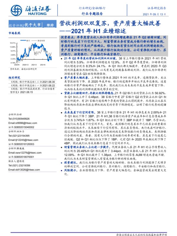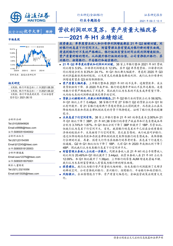 【海通证券】【20210913】2021年H1业绩综述:营收利润双双复苏,资产质量大幅改善-16页