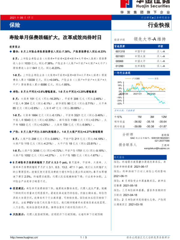 【华金证券】【20210917】寿险单月保费跌幅扩大,改革成效尚待时日-5页