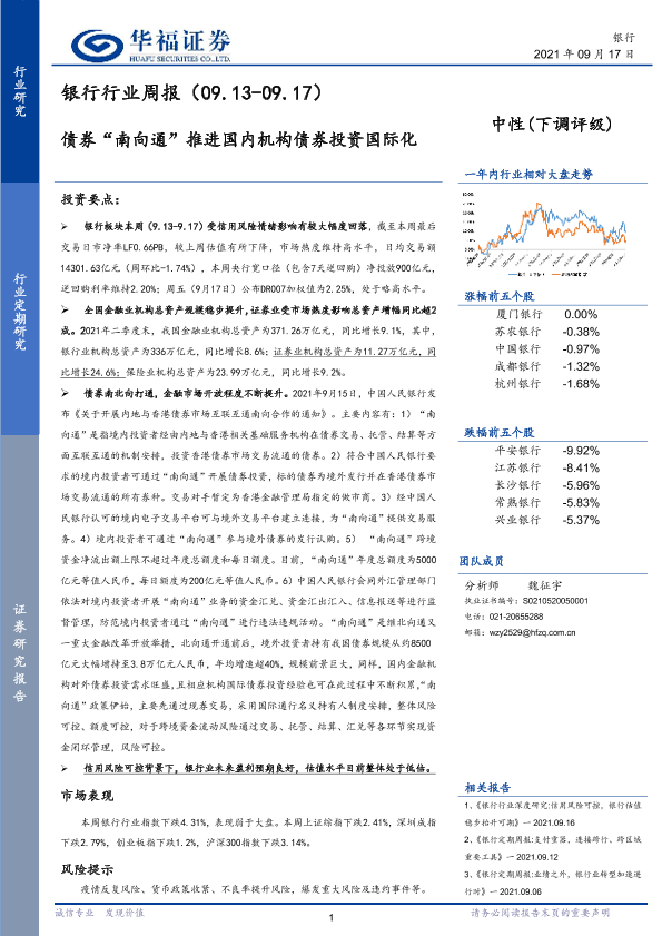 【华福证券】【20210917】银行行业周报:债券“南向通”推进国内机构债券投资国际化-18页