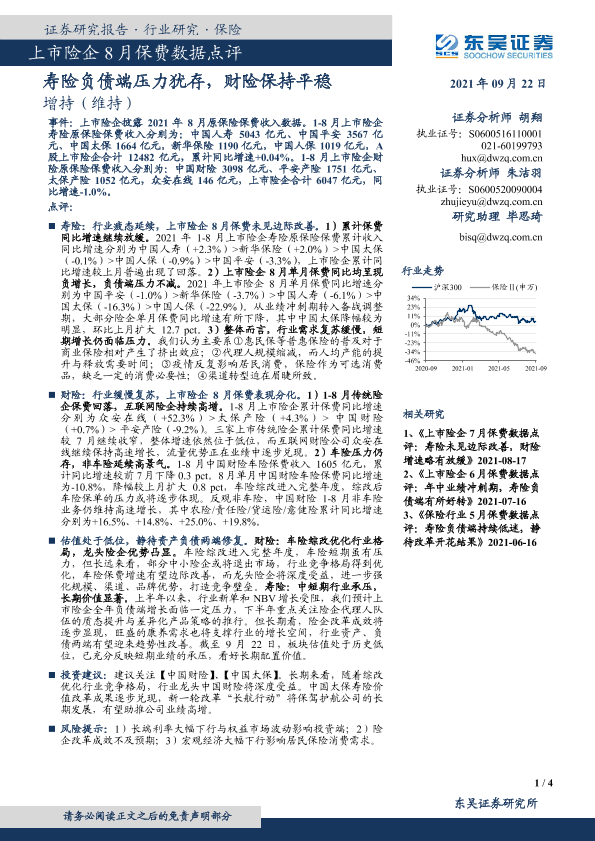 【东吴证券】【20210922】上市险企8月保费数据点评-4页