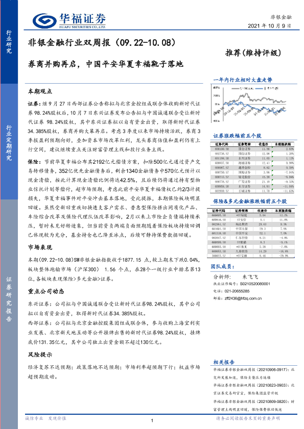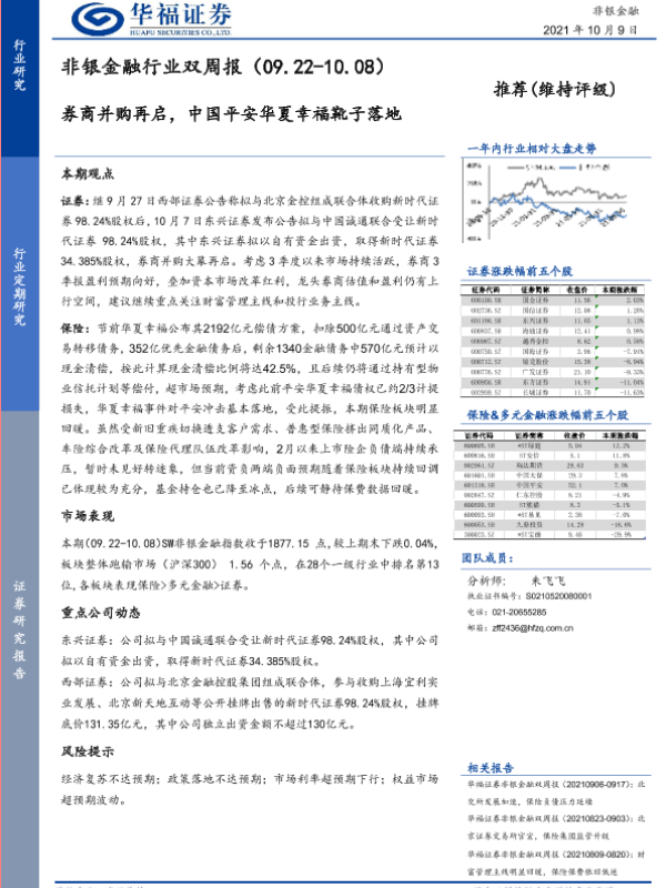 【华福证券】【20211009】非银金融行业双周报:券商并购再启,中国平安华夏幸福靴子落地-9页