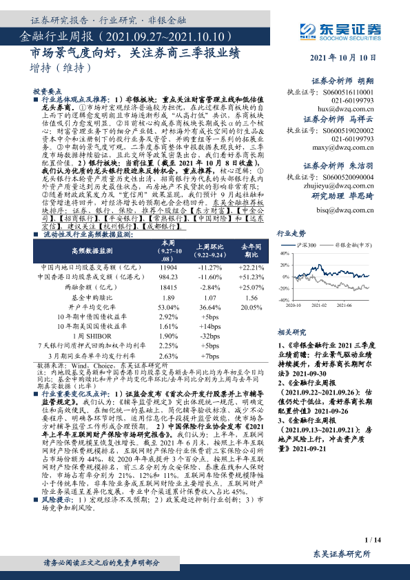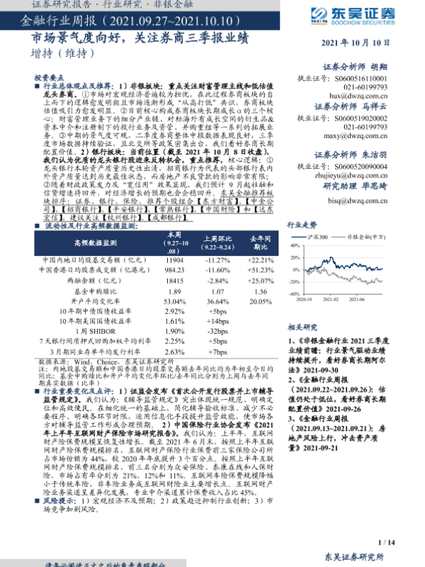 【东吴证券】【20211010】金融行业周报:市场景气度向好,关注券商三季报业绩-14页