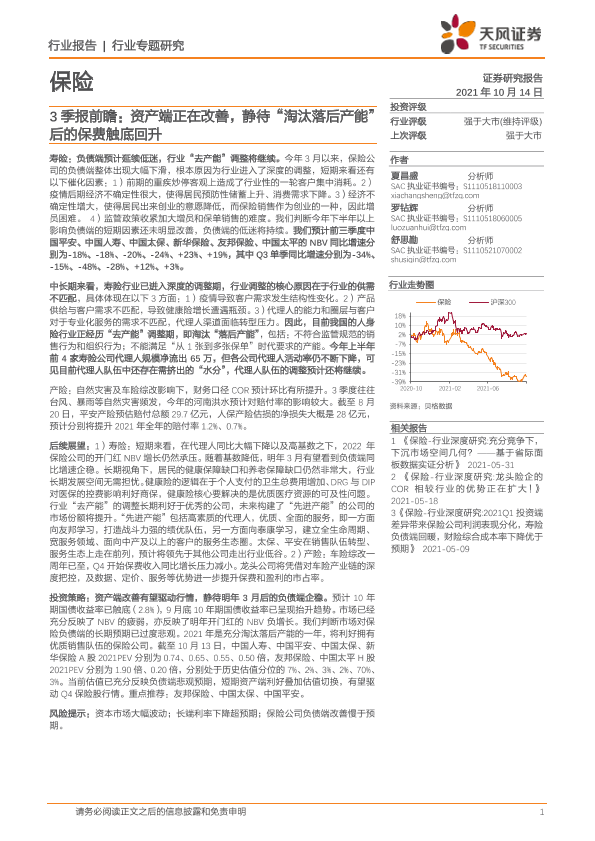 【天风证券】【20211014】保险3季报前瞻:资产端正在改善,静待“淘汰落后产能”后的保费触底回升-15页