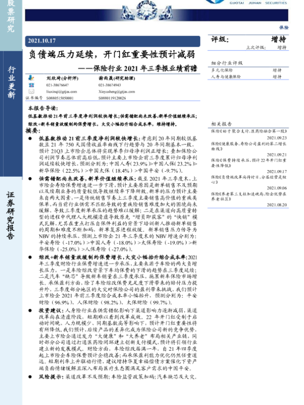【国泰君安证券】【20211017】保险行业2021年三季报业绩前瞻:负债端压力延续,开门红重要性预计减弱-8页