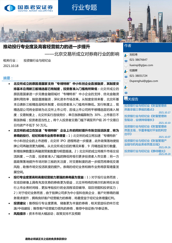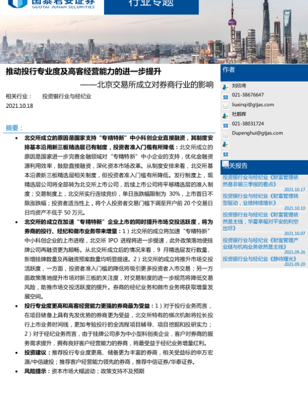 【国泰君安证券】【20211018】推动投行专业度及高客经营能力的进一步提升——北京交易所成立对券商行业的影响-11页