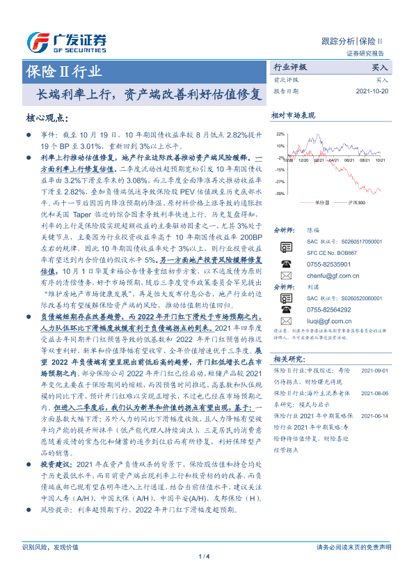 【广发证券】【20211020】保险Ⅱ行业:长端利率上行,资产端改善利好估值修复-4页