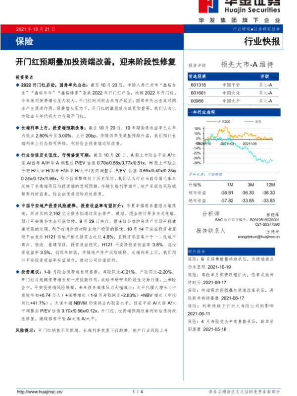【华金证券】【20211021】保险行业快报:开门红预期叠加投资端改善,迎来阶段性修复-4页