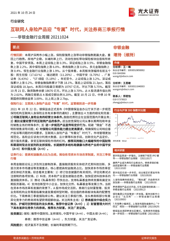 【光大证券】【20211024】非银金融行业周报:互联网人身险产品迎“专属”时代,关注券商三季报行情-11页