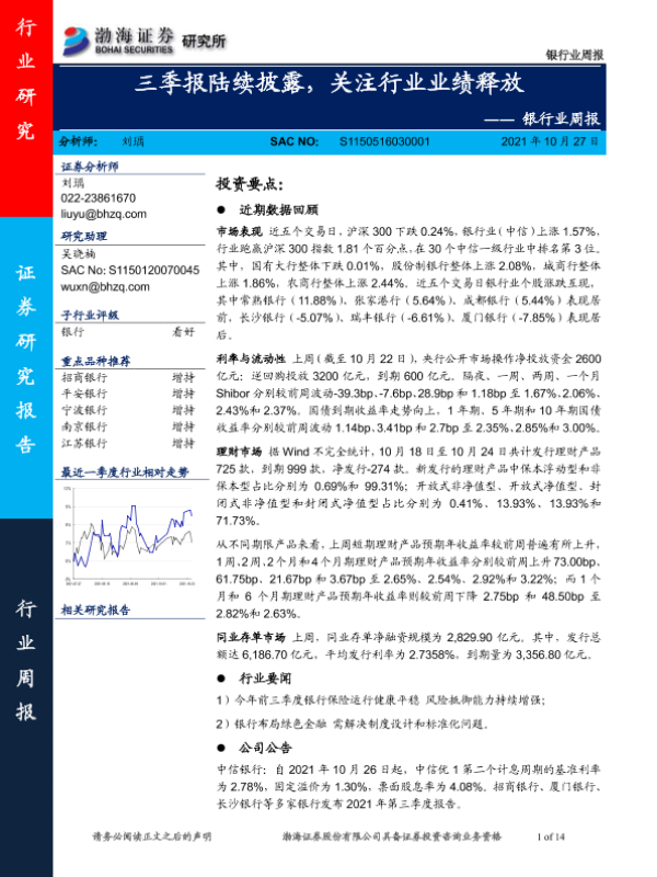 【渤海证券】【20211027】银行业周报:三季报陆续披露,关注行业业绩释放-14页