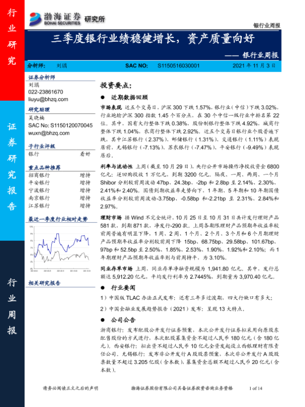 【渤海证券】【20211103】三季度银行业绩稳健增长,资产质量向好-14页
