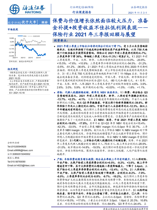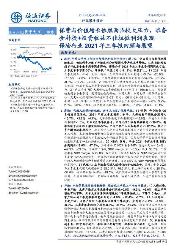 【海通证券】【20211103】保险行业2021年三季报回顾与展望:保费与价值增长依然面临较大压力,准备金补提+投资收益不佳拉低利润表现-22页