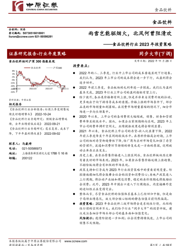 【中原证券】【20221128】食品饮料行业2023年投资策略:雨雪岂能驱烟火,北风何曾阻清欢-18页