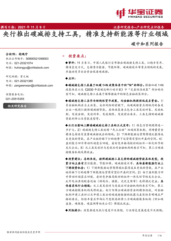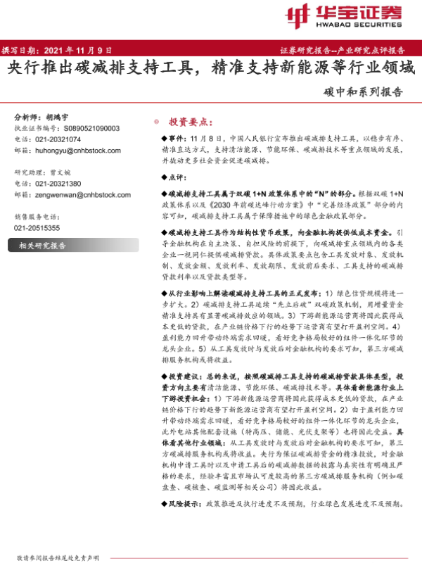 【华宝证券】【2021】碳中和系列报告:央行推出碳减排支持工具,精准支持新能源等行业领域-6页
