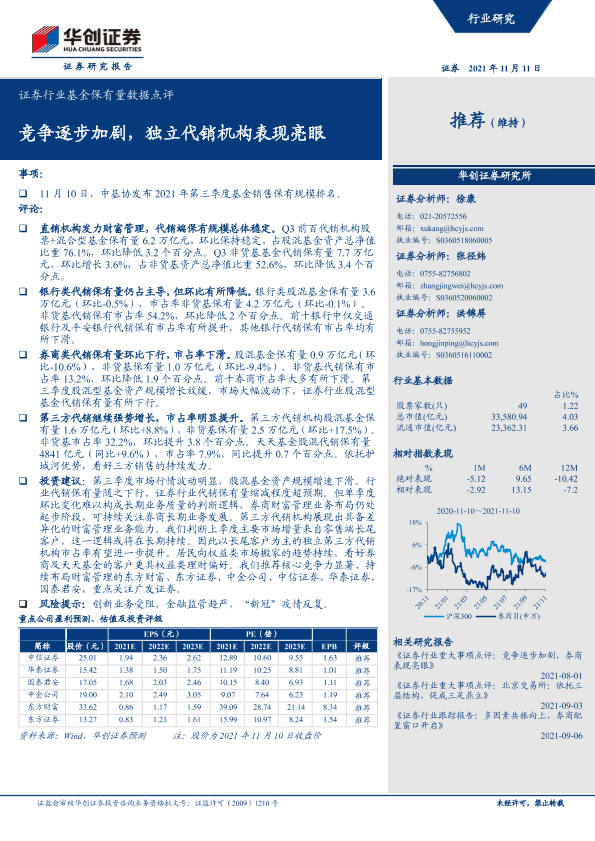 【华创证券】【20211111】证券行业基金保有量数据点评:竞争逐步加剧,独立代销机构表现亮眼-5页